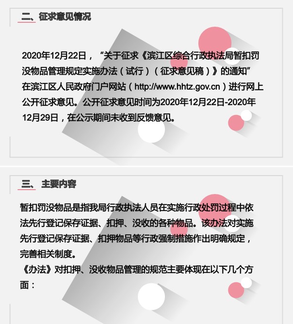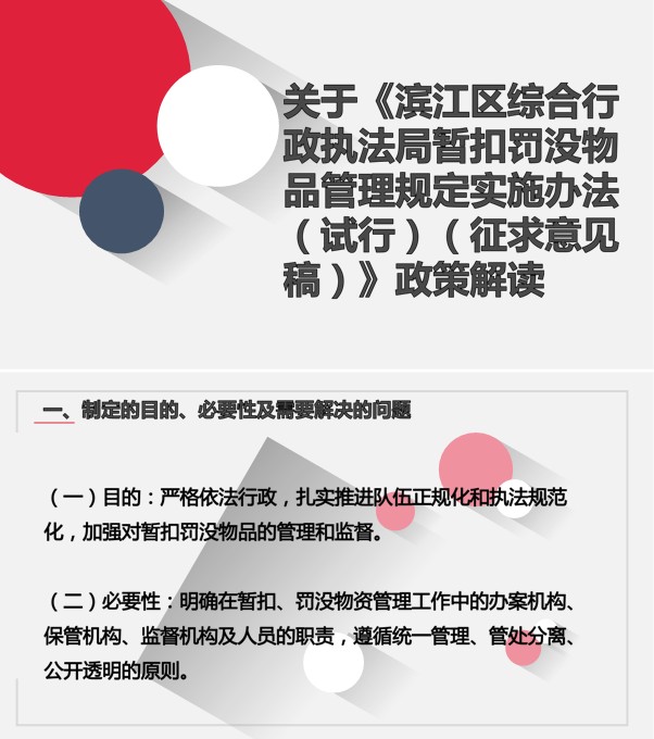 【負責人解讀】圖解 關于《濱江區綜合行政執法局暫扣罰沒物品管理規定實施辦法(試行)(征求意見稿)》政策解讀
