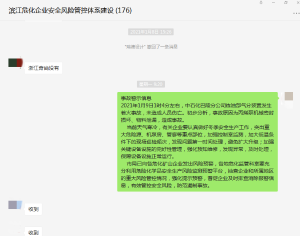 深刻吸取近期省內外危化品生產安全事故教訓,通過微信企業群轉發事故警示信息,加強與轄區內企業的信息交流,動態掌握企業實時生產狀況,并督導企業落實重點區域、重點崗位隱患自查自改工作,做到安全風險“心里明”,問題隱患“及時消”。