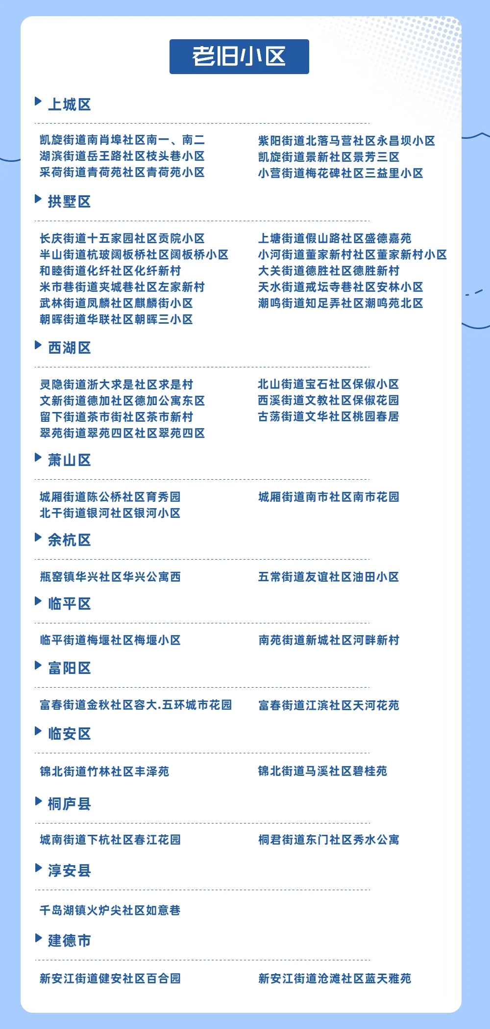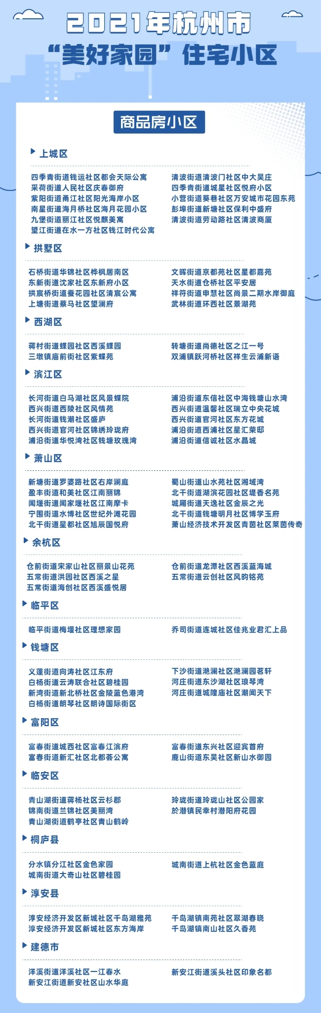 經過征集申報、整治提升、滿意度調查、兩級驗收評估、審核認定等環節,今天,杭州公布了2021年“美好家園”住宅示范小區名單,148個住宅小區入選,其中商品房小區76個、老舊小區40個,保障房小區32個。