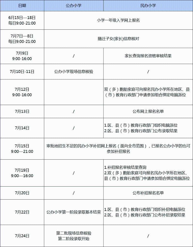 6月8日-17日公辦初中第一階段錄取,7月12日-22日公辦小學第一階段錄取。錄取時,在選報公辦學校的兒童少年中,按照“住、戶一致”優先原則和“同表次按學生落戶時間先后”原則排序。其中,公辦小學錄取兒童戶籍、父母戶籍、家庭住房三者一致且均在學校學區內的兒童,以及本學區內世居家庭兒童(公辦初中同);公辦初中錄取對口小學畢業且學生戶籍、父母戶籍、家庭住房三者一致,且均在對口小學學區內的學生。
