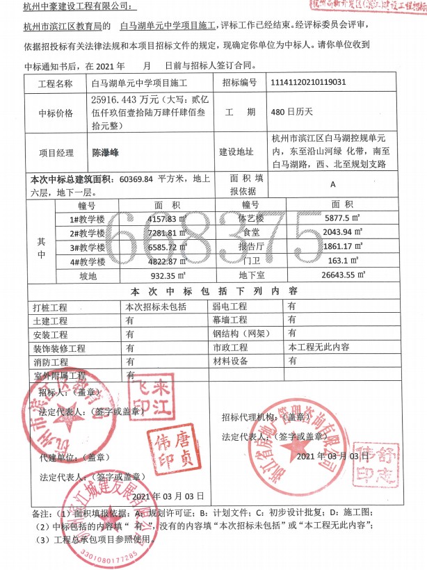 白馬湖單元中學施工中標通知書