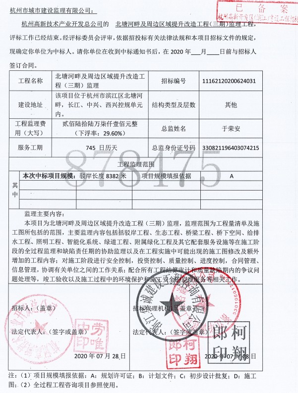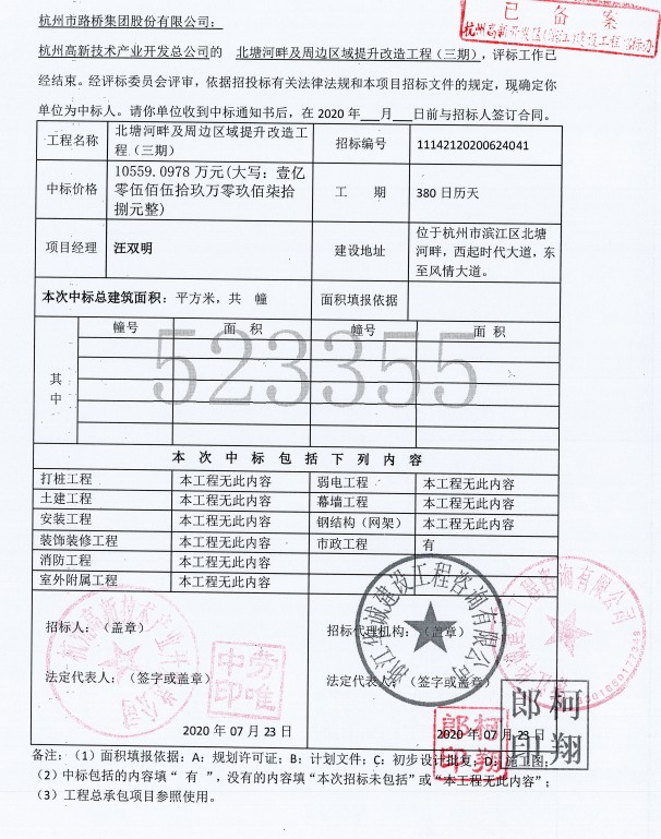 北塘河項目施工中標通知書