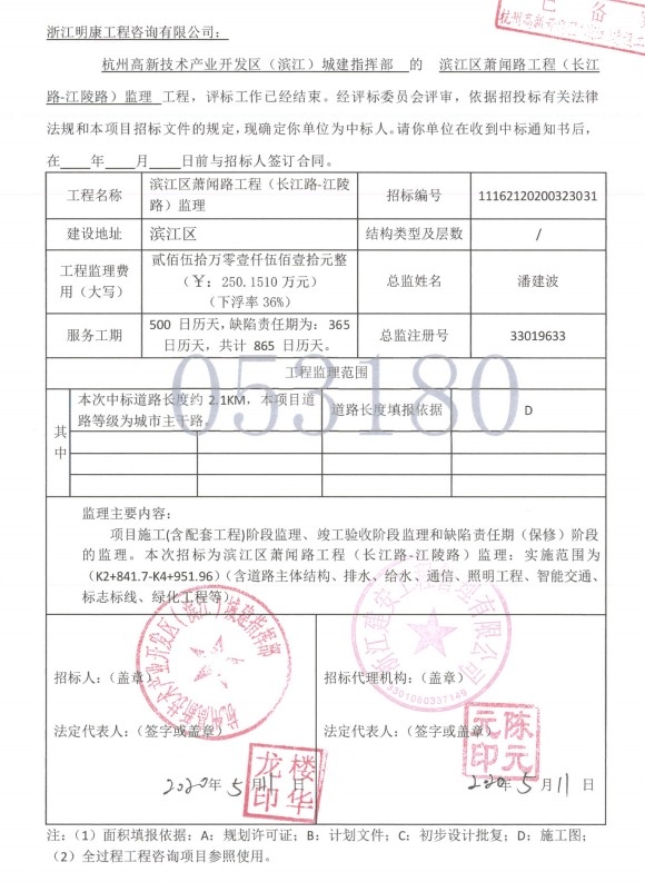 蕭聞路工程監(jiān)理中標通知書