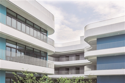 走進(jìn)學(xué)校,大量流線型的建筑輪廓搭配縱向欄桿線條,構(gòu)建出現(xiàn)代而充滿創(chuàng)意的優(yōu)美校園。從天空俯瞰硅谷小學(xué),學(xué)校的教學(xué)樓就像一片片多彩的拼圖,風(fēng)雨連廊串聯(lián)起教學(xué)樓、美術(shù)樓、體育館、食堂等教學(xué)生活空間。