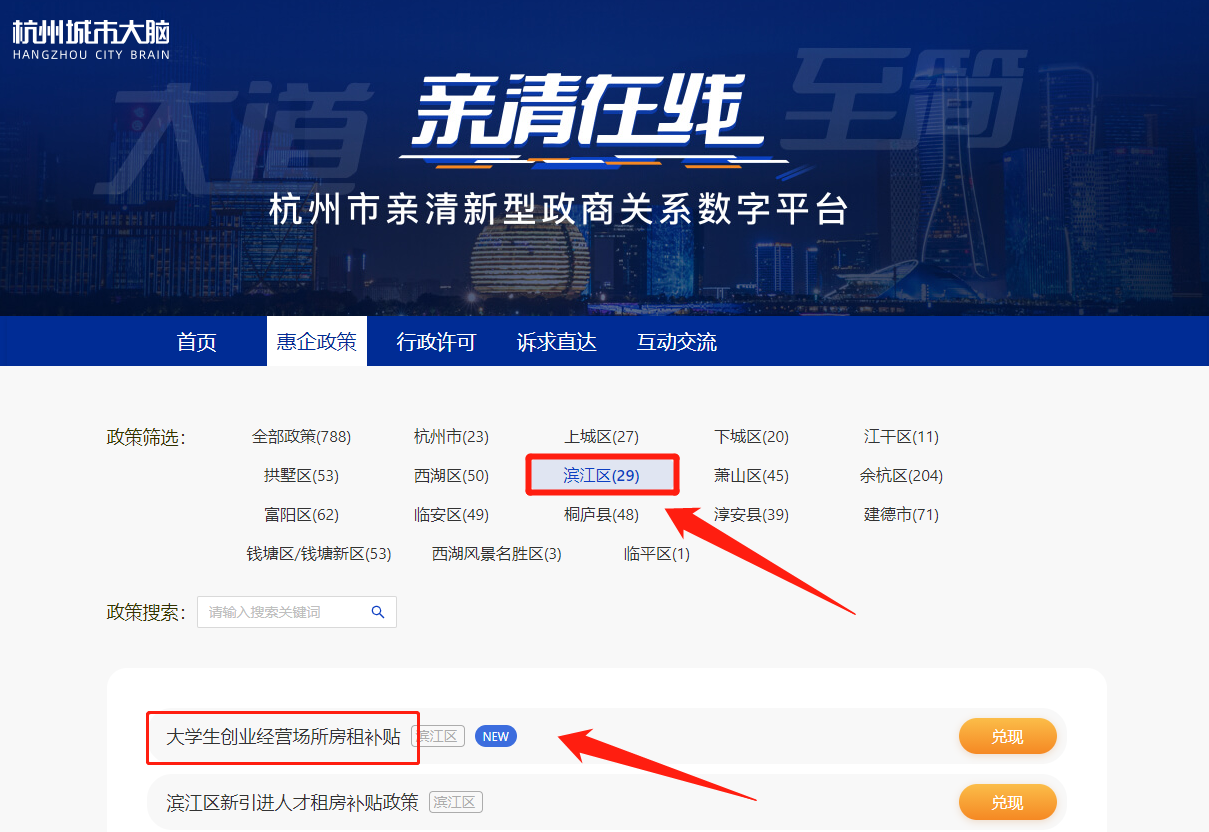 親清在線https://qinqing.hangzhou.gov.cn,濱江區大學生創業經營場所房租補貼申請。