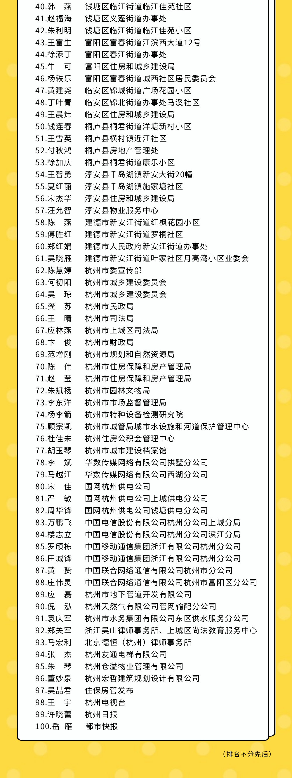 傳播加梯“好聲音”,凝聚加梯“正能量”,為此,杭州啟動了“最美加梯人(項目)”評選活動。每一臺加梯背后都有積極牽頭、支持參與加梯的業主(不少是低樓層業主);有全心全意、辛勤付出的街道、社區工作人員;有統籌指導、協調服務的各級有關部門人員;有全力支持、提供優質服務的管線單位工作人員;以及相關專家、人大代表、政協委員、熱心市民等社會人士,他們用心用情、不求回報參與加梯志愿服務……與此同時,杭州電視臺、《杭州日報》、《都市快報》等主流媒體也積極關注報道加梯工作,他們傳遞加梯信息、講好加梯故事、挖掘加梯做法,營造良好輿論氛圍,加深群眾對加梯的理解,為一個個成功加裝電梯項目貢獻了堅實的媒體力量。