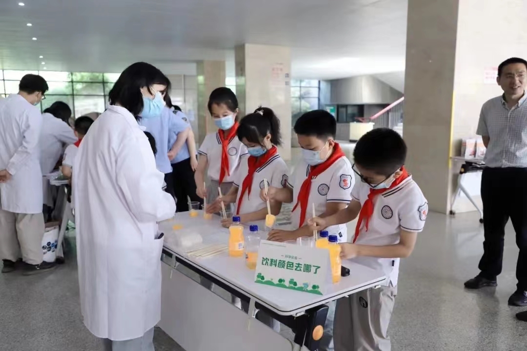 —“食用農(nóng)產(chǎn)品快速檢測(cè)”實(shí)驗(yàn)— 工作人員通過(guò)詳細(xì)講解儀器名稱及使用方法,介紹快速檢測(cè)流程,操作步驟等讓同學(xué)們了解食品如何檢測(cè),并對(duì)學(xué)校食堂提供的蔬菜樣品和水果進(jìn)行了現(xiàn)場(chǎng)快速檢測(cè),向同學(xué)們演示快速檢測(cè)全流程。 —“飲料顏色去哪兒了”— 工作人員帶領(lǐng)同學(xué)們動(dòng)手操作,通過(guò)觀察簡(jiǎn)單易懂的實(shí)驗(yàn)過(guò)程和結(jié)果,加深同學(xué)們對(duì)色素的認(rèn)識(shí)。 —“自制檸檬碳酸飲料”— 通過(guò)檸檬和蘇打粉兩樣簡(jiǎn)單的材料,工作人員帶領(lǐng)同學(xué)們動(dòng)手制作碳酸飲料,讓同學(xué)們真切感受氣泡產(chǎn)生的過(guò)程。 三、食品安全知識(shí)互動(dòng)游戲 通過(guò)食品安全飛行棋游戲,讓同學(xué)們學(xué)習(xí)食品安全知識(shí),寓教于樂(lè),受到了同學(xué)們的一致好評(píng)。 “今天的活動(dòng),我很喜歡,學(xué)習(xí)到了很多有用的食品安全知識(shí),回到家后,我一定會(huì)好好監(jiān)督家里的食品安全的!”參與活動(dòng)的學(xué)生說(shuō)道。活動(dòng)現(xiàn)場(chǎng)氣氛熱烈,同學(xué)們積極互動(dòng)、踴躍發(fā)言、主動(dòng)參與。此次活動(dòng)營(yíng)造了濃厚的食品安全氛圍,提高了同學(xué)們對(duì)食品的辨識(shí)力。本次活動(dòng)是食品安全宣傳月的系列活動(dòng)之一,區(qū)市場(chǎng)監(jiān)管局除了前往濱和實(shí)驗(yàn)小學(xué)進(jìn)行食品安全知識(shí)宣傳外,還前往區(qū)內(nèi)其他中小學(xué)、幼兒園進(jìn)行食品安全進(jìn)校園活動(dòng),幫助同學(xué)們從小樹(shù)立食品安全的意識(shí)。