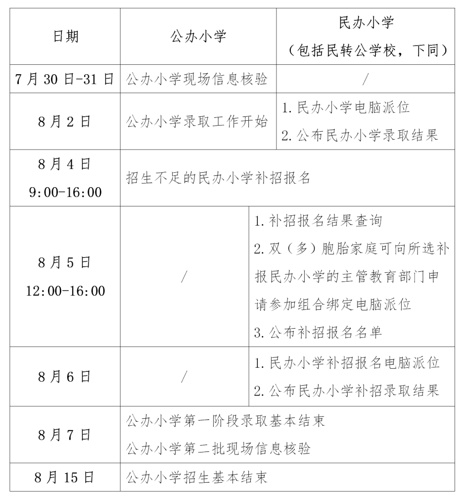 根據《關于做好2022年義務教育階段學校招生入學工作的通知》要求和入學流程,2022年杭州市小學一年級入學現場信息核驗工作將于7月30日、31日兩天進行(報名民辦小學審核通過但電腦派位未錄取的兒童于8月7日進行公辦小學招生現場信息核驗),請申請公辦小學入學的適齡兒童家長,根據區、縣(市)教育局(社發局)的相關公告參加現場信息核驗。 一、2022年杭州市小學一年級 入學后續時間安排