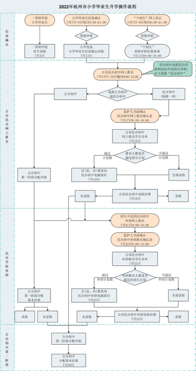 1.小升初具體日程如何安排? 2.2022年小學應屆畢業生升學報名如何進行? 答:2022年小升初繼續實行網上報名,包括小學應屆畢業生信息確認和網上報名2個階段。符合在我市就讀初中條件的小學應屆畢業生(監護人)應在規定時間登錄浙里辦APP(手機端)——義務教育階段學校學生入學一件事聯辦(或搜索入學早知道)——杭州市小升初管理系統(電腦端網站址:czbm.hzedu.gov.cn)進行信息確認和網上報名。報名時,應在公辦初中或民辦初中(包括民轉公學校,下同)中選報一類,其中選報民辦初中者限選報一所,具體操作按照系統提示進行。報名時間截止后,報名信息不能更改。 ※溫馨提示 (1)小升初招生錄取工作由各區、縣(市)教育行政部門組織實施,具體方案詳見各區、縣(市)教育行政部門公告。 (2)小學應屆畢業生信息確認時間為7月7日-9日(每日9:00-21:00)(桐廬縣詳見當地教育局公告)。 網上報名時間:7月15日-16日(每日9:00--21:00)。 (3)在系統開放的任意時間內完成相應操作即可,完成操作的具體時間不影響招生錄取順序和升學結果。通常系統開放第一天(7月7日)注冊登錄人數較多,容易發生網絡擁堵,建議主城區家長于7月8日開始注冊登錄,分流高峰。 “小升初管理系統”支持手機端操作,也可以使用電腦并選擇360(極速模式)、火狐、谷歌等瀏覽器。期間如出現無法正常登錄系統等情況,請檢查網絡連接是否正常、電腦瀏覽器版本及設置是否符合要求,也可聯系孩子在讀小學班主任或教務員,由其提供幫助。建議家長適當留出處置時間,不要在7月9日和7月16日晚上臨近系統關閉時操作,避免因突遇電腦故障、網絡故障等,導致無法在規定時間內完成相應操作,影響升學。 3.“個別生”的對象有哪些?報名如何進行? 答:“個別生”是指符合下列條件之一的小學畢業生: ①具有上城區、拱墅區、西湖區、濱江區、錢塘區、西湖風景名勝區戶籍,在上述區域以外的小學就讀,要求回戶籍地升學的小學畢業生。(注:戶籍與就讀學校分別屬于上述區域中不同區的,不屬于“個別生”,應登錄“小學應屆畢業生信息確認”界面填報。) ②具有蕭山區、余杭區、臨平區、富陽區、臨安區、桐廬縣、淳安縣、建德市戶籍,在非本區、縣(市)小學就讀,要求回戶籍地升學的小學畢業生。(舉例:如戶籍在蕭山區,實際就讀小學不在蕭山區,要求回蕭山區升學的,應按“個別生”報名。) ③符合市委市政府《關于杭州市高層次人才、創新創業人才及團隊引進培養工作的若干意見》(市委〔2015〕2號)等規定引進的高層次人才、創新創業人才子女和省委人才辦認定的在杭省部屬單位引進的高層次人才子女;持有屬地為杭州的《浙江省海外高層次人才居住證》的引進人才等各級各類經營管理人才、創新創業人才的子女,在外地小學畢業,要求到杭州市升學的。 2022年小升初“個別生”實行網上報名,包括網上登記和網上報名2個階段,信息網上登記時間為7月7日-9日(每日9:00-21:00),網上報名時間為7月15日-16日(每日9:00--21:00)。 符合在我市就讀初中條件的“個別生”(監護人)應在規定時間登錄浙里辦APP(手機端)——義務教育階段學校學生入學一件事聯辦(或搜索入學早知道)——杭州市小升初管理系統(電腦端網站址:czbm.hzedu.gov.cn)進行相關操作。 4. 2022年小學畢業生升學網上報名的對象有哪些? 答:經區、縣(市)教育行政部門審核通過的小學應屆畢業生(含“個別生”),不包括已被杭州外國語學校初中部、浙江省音樂學院附屬音樂學校錄取和一貫制學校直升的學生。 報名時,應在公辦初中或民辦初中中選報一類,其中選報民辦初中者,在“確認升學區、縣(市)”的區域內限報一所。 5.選報民辦初中前,監護人需要做哪些準備? 答:監護人應了解擬報學校的辦學情況,如辦學理念、辦學特色、辦學條件、收費標準、招生規模、住宿條件等信息,根據孩子和家庭情況,慎重考慮,理性選擇。 根據國家、省市有關規定,我市“公參民”學校(含其他民辦義務教育學校,下同)今年轉為公辦學校的,仍按原方式招生,招生范圍、報名及錄取等與今年民辦學校招生相同。 6. 民辦學校招生范圍是怎么樣的? 答:根據國家、省市有關文件精神,區、縣(市)教育行政部門批設的民辦學校在所在區、縣(市)范圍內招生,未招足的民辦學??衫^續在所在區、縣(市)范圍內補招一次(余杭區、臨平區范圍內民辦學校今年在上述兩區范圍內招生和補招,下同);市教育局批設的民辦學校(杭州綠城育華學校、杭州云谷學校、杭州娃哈哈雙語學校)應先在學校所在區范圍內招生,所在區范圍內招不滿的,可申請并經市教育局同意,在市域范圍內補招一次。 7.民辦初中補招網上報名對象有哪些? 答:除已被杭州外國語學校初中部、浙江省音樂學院附屬音樂學校、民辦初中錄取和一貫制學校直升的學生外,所有經區、縣(市)教育行政部門審核通過的小學應屆畢業生(含“個別生”)均可報名,包括已報名公辦初中的學生和報名民辦初中未錄取的學生。 招生不足的民辦初中補招報名時間:7月21日9:00-16:00。 8. 在九年制學校就讀的六年級學生可以參加民辦初中網上報名嗎? 答:初中的招生對象為小學畢業生,九年制學校是否校內直升,由主管的區、縣(市)教育行政部門根據該校的學制和課程設置情況確定,并已提前告知家長。具體情況可咨詢就讀學校及學校所在區、縣(市)教育行政部