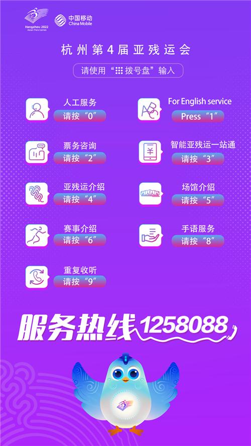亞殘運會期間,1258088繼續設置英語座席,中國移動網站、中國移動App在線客服界面將布放在線英文人工服務入口,為國際友人提供多場景雙語服務。