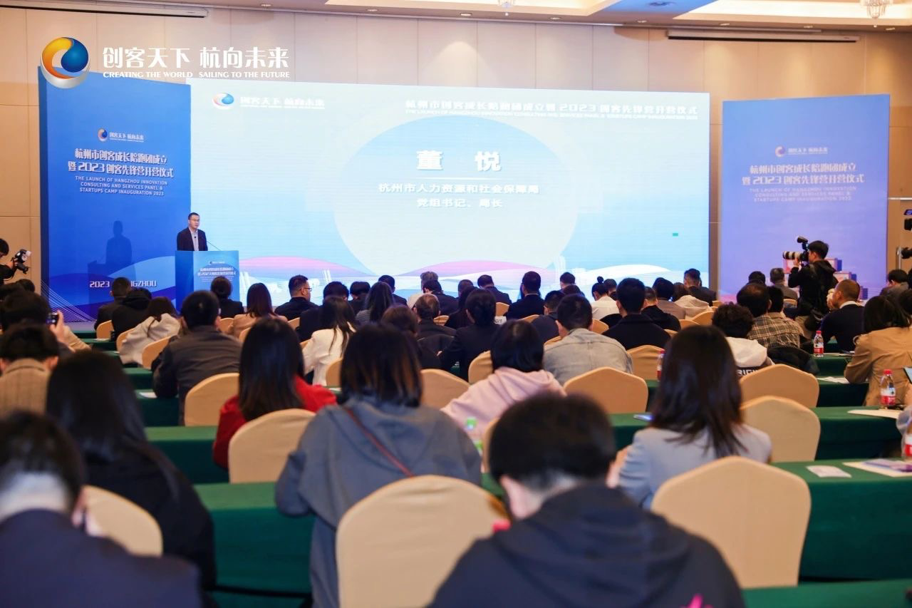 市人力社保局局長董悅致辭,介紹了創客成長陪跑團和創客先鋒營成立的背景和意義,邀請杭州市海歸創業典型、知名投資人、知名企業家、行業專業人士等擔任陪跑團成員,為海外人才在杭創業一路陪跑相隨,幫助大家解決創新創業道路上難點痛點問題。