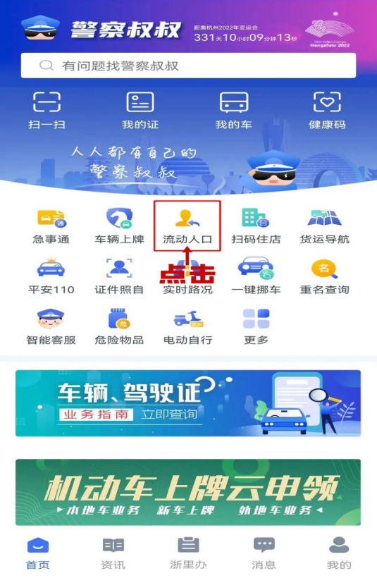 第一步,進入“警察叔叔”APP,點擊首頁“流動人口”欄目。