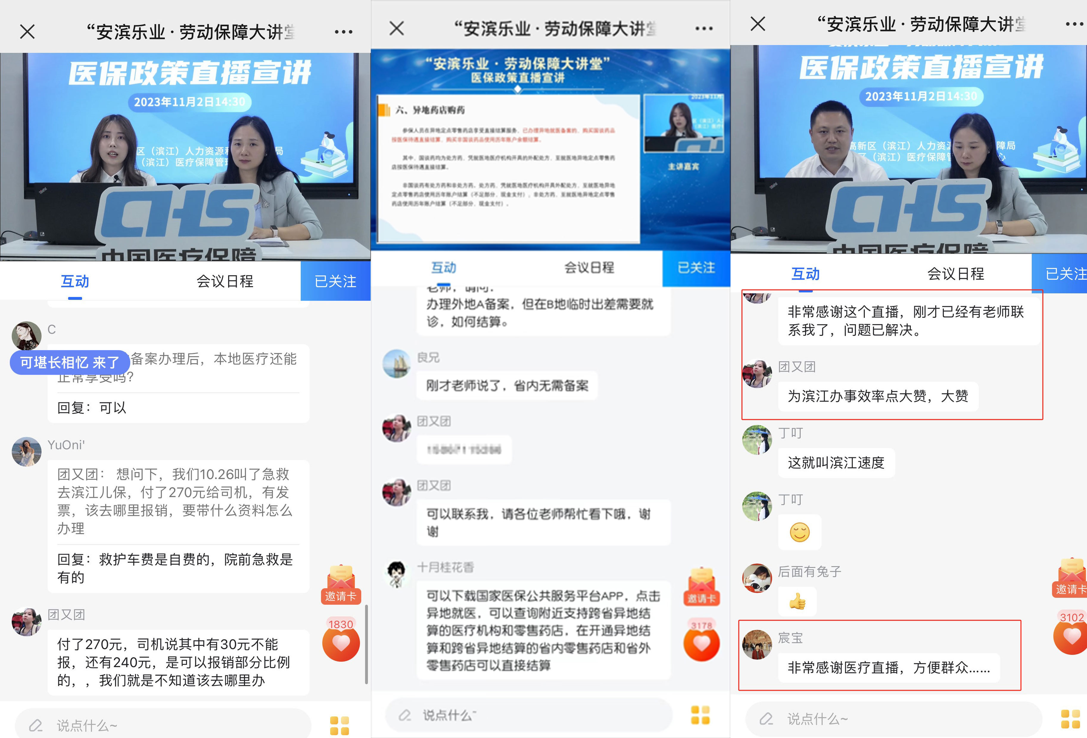 直播尚在進行中,“團又團”女士的問題已經得到了解決。濱江區醫保中心竭誠為民服務的精神和極高的辦事效率得到了“團又團”女士和直播間觀眾的真誠點贊。