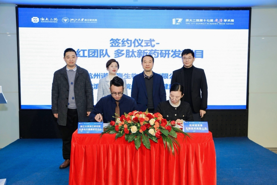 余紅教授團隊項目“多肽新藥研發項目”依托“杭州諾芙泰生物技術有限公司”作為科技成果轉化載體,在生命與大健康研究中心的牽頭下,與浙江大學濱江研究院達成入孵落地簽約。
