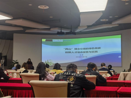 浙江科技大學碳中和創新研究中心王妍老師以《“兩山”理念引領的綠色低碳創新人才培養探索與實踐》為題,介紹了浙江科技大學在國家雙碳目標提出后,成立了碳中和創新研究中心。學校以 “兩山”理念為引領,對綠色低碳創新人才培養機制、路徑、模式進行了探究,形成情景化、項目化、專業化和國際化的綠色低碳創新人才“四化”培養模式。