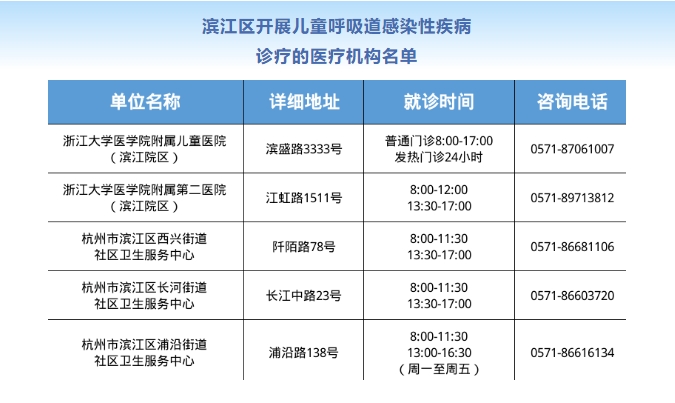 為滿足兒童呼吸道疾病醫療救治工作,保障人民群眾的就醫需求與身體健康,現將濱江區開展兒童呼吸道感染性疾病診療醫療機構具體名單公布如下(截至11月30日)。如有需要,可撥打電話咨詢。