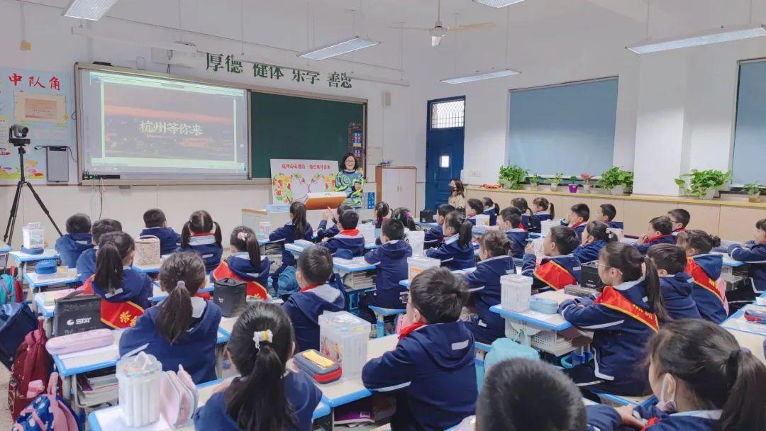 “杭州的春天在哪里呢?”首先,由聞濤小學的7位小朋友化身小導游,以亞運小主人的身份,通過鏡頭帶領阿克蘇的師生們云游了聞濤校園、奧體中心蓮花碗以及杭州西湖,尋找到了他們眼中杭州的美麗春天,并將亞運文化和杭州的美好形象生動地傳遞給遠在千里之外的新疆朋友。緊接著,阿克蘇天杭實驗小學的小朋友也通過圖片和視頻展示,向聞濤小學的師生介紹了他們校園以及阿克蘇的美麗春景。短短幾分鐘,兩地學生依次展現了各自家鄉的“美”,并將兩地有代表性的地域、文化特色,生動地呈現在大家眼前,贏得了陣陣熱烈的掌聲,更進一步激發了孩子們熱愛家鄉的情感。課堂最后,杭阿兩地小朋友一起巧繪春日,畫出自己心中最美麗的春天景色和最美好的春天故事。