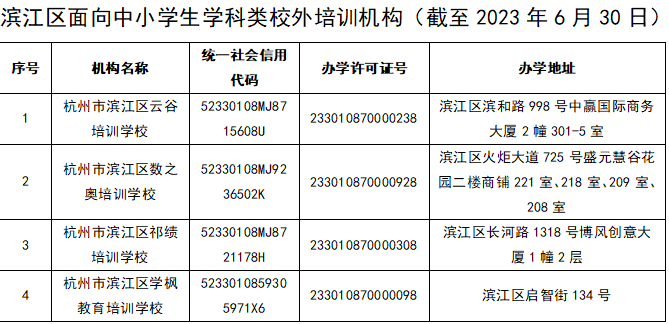 根據(jù)中共中央辦公廳、國(guó)務(wù)院辦公廳印發(fā)的《關(guān)于進(jìn)一步減輕義務(wù)教育階段學(xué)生作業(yè)負(fù)擔(dān)和校外培訓(xùn)負(fù)擔(dān)的意見(jiàn)》等文件要求,規(guī)范我區(qū)校外培訓(xùn)機(jī)構(gòu)辦學(xué)行為,現(xiàn)將經(jīng)我區(qū)教育部門(mén)審批的面向中小學(xué)生開(kāi)展學(xué)科類(lèi)培訓(xùn)的校外培訓(xùn)機(jī)構(gòu)公布如下: