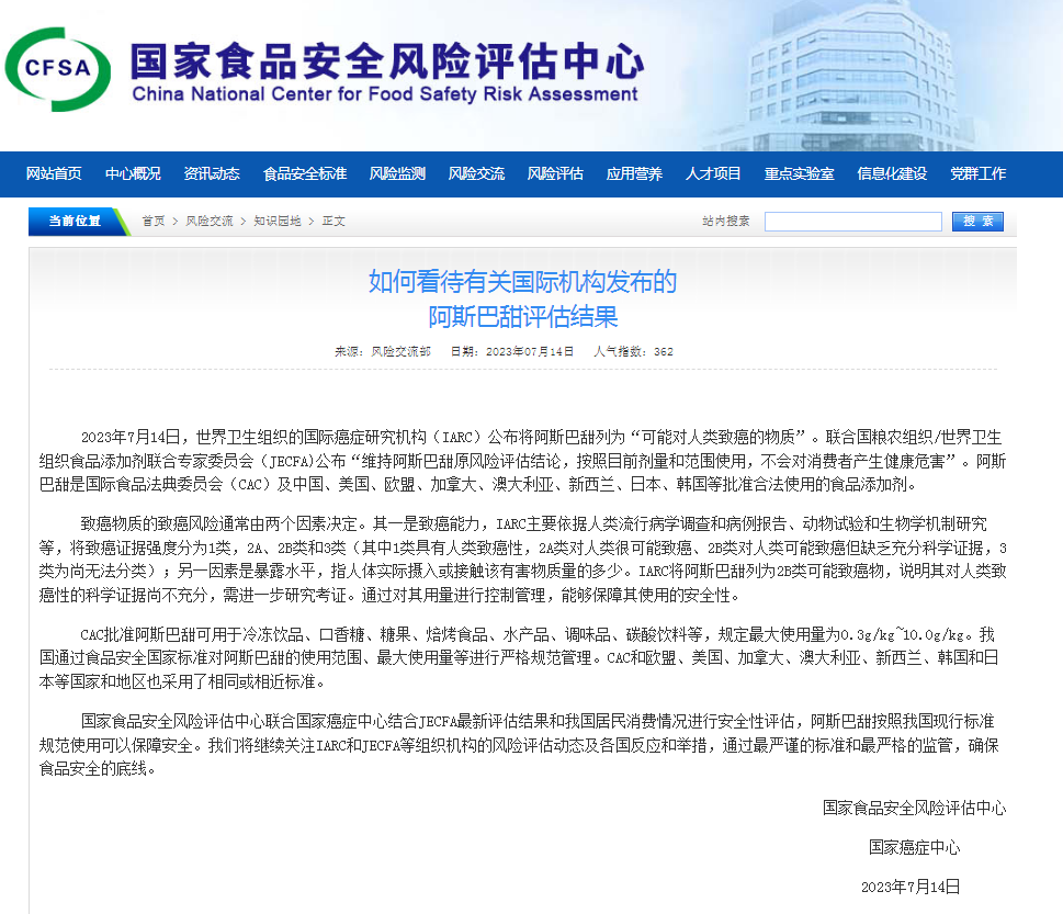 國家食品安全風險評估中心網站14日發文闡述如何看待有關國際機構發布的阿斯巴甜評估結果。