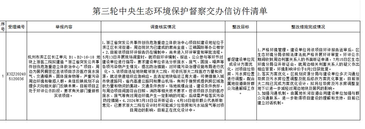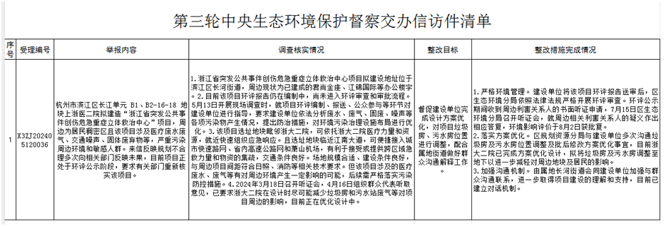 濱江區公開第三輪中央生態環境保護督察信訪件辦理情況