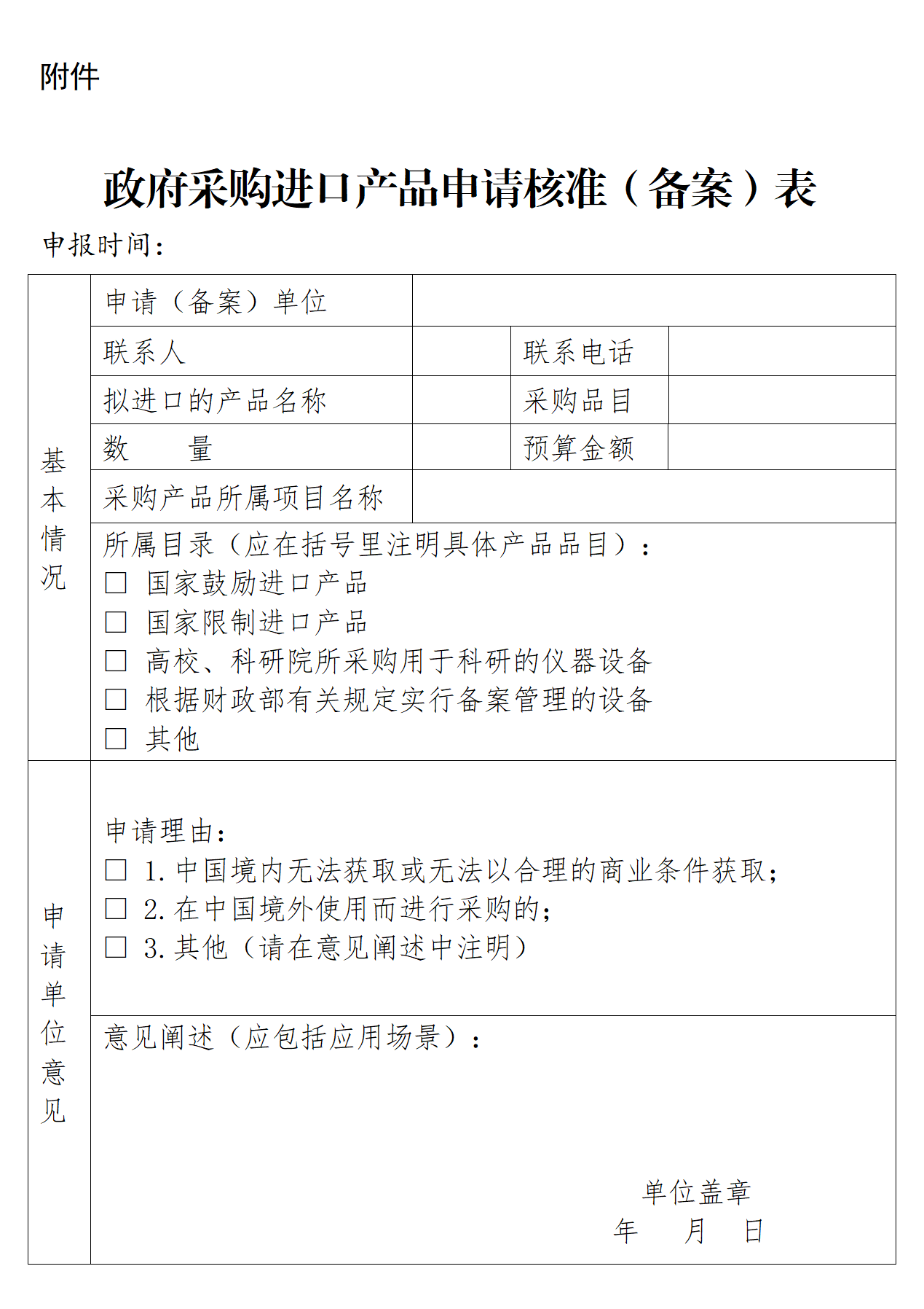 四、采購人申請采購進口產品核準或者備案的,應當出具《政府采購進口產品申請核準(備案)表》(詳見附件)。申請采購進口產品核準的,應當按照下列情況同時出具相應材料: