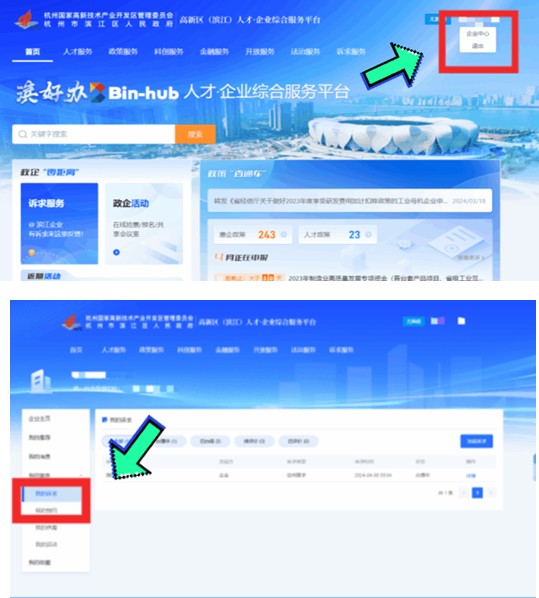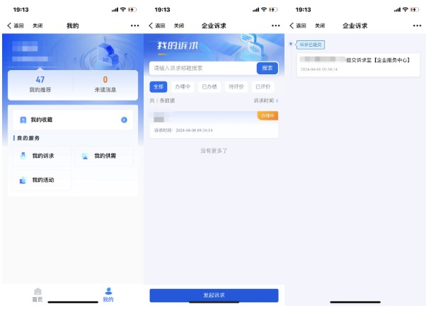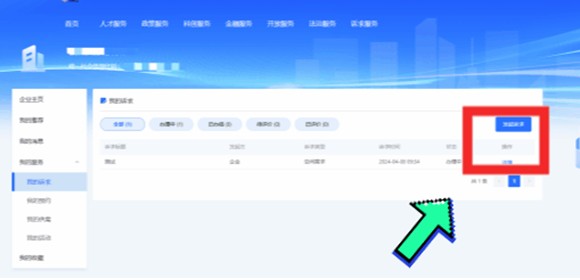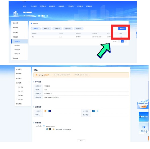在登陸后點擊主頁右上角企業名稱下方的“企業中心”,進入企業中心后,依次點擊左欄菜單的“我的服務”----“我的訴求”,即可看到企業已經提交的訴求工單。