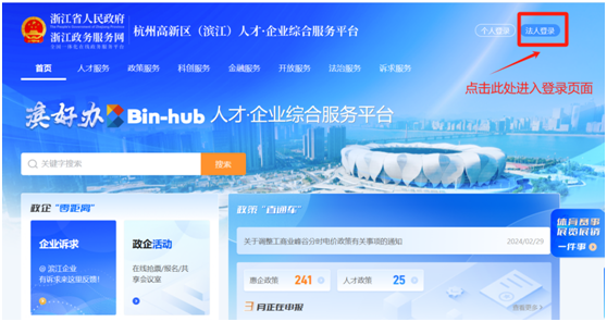 1、PC端進入平臺后點擊右上角“法人登錄”按鈕,可跳轉至浙江省政務服務網登錄界面,使用法人賬號密碼、浙里辦APP掃碼或營業執照等進行登錄即可,無需額外注冊,登錄成功后即返回平臺首頁。