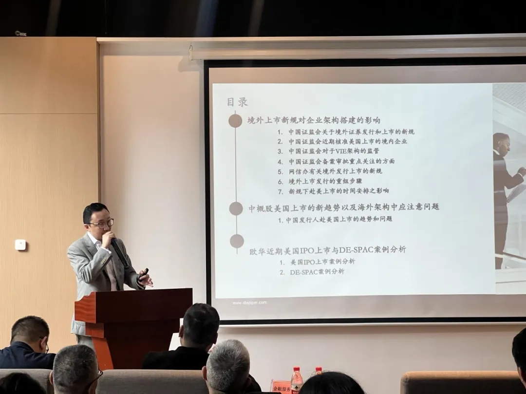 會上結合時事新聞對備案新規的背景展開講述,從行業、營收、目的三個方面分析企業是否適合境外上市,其中著重講解了納斯達克資本市場板塊上市條件和美股IPO上市架構如何搭建,并就目前已公開的備案數據對備案通過的行業類型和上市地等多方面分析了新規下證監會對企業備案的反饋情況。