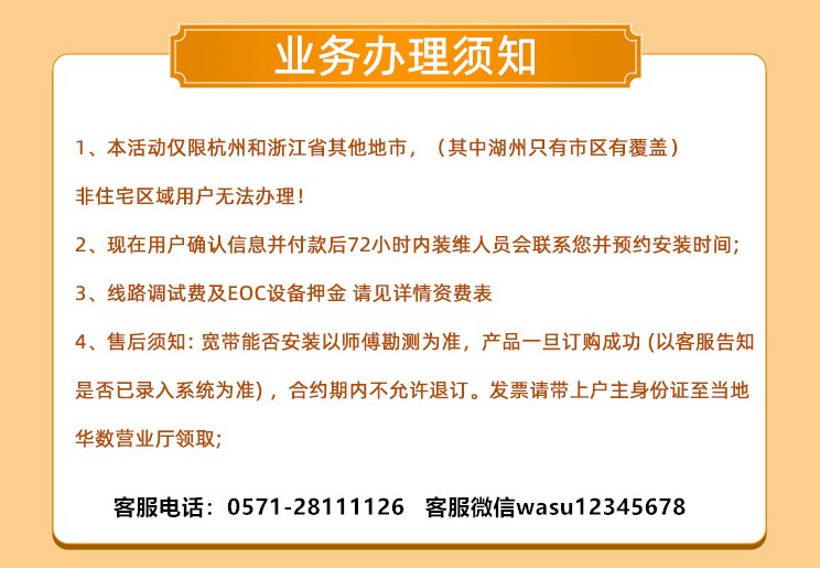 注:只是上網寬帶,不含電視機頂盒,只限新裝用戶辦理,部分農網/光纖小區,需支付50元-100元押金設備,由安裝師傅上門收取并開具收據,下單后2天左右師傅約上門安裝,自己準備無線路由器。(續費用戶下單無效)