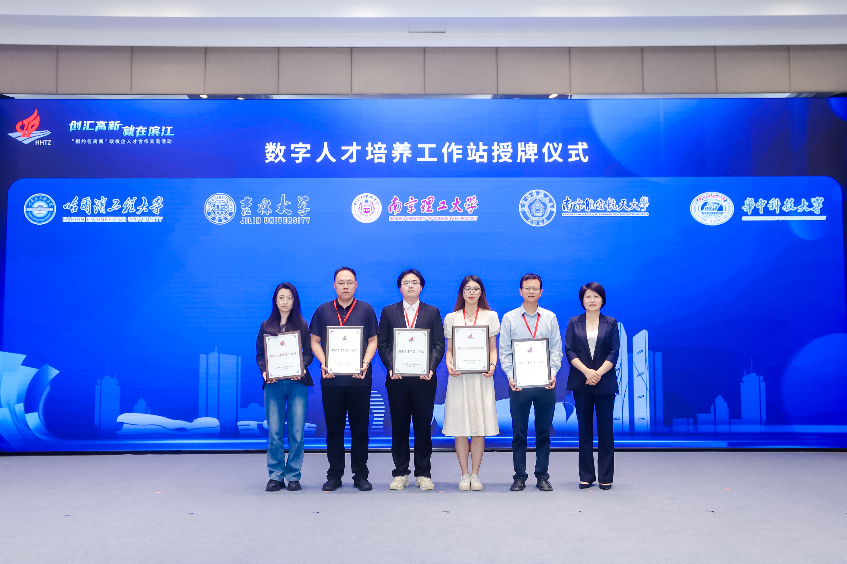 包嘉穎副區長向哈爾濱工程大學、吉林大學、南京理工大學、南京航空航天大學、華中科技大學等5所高校授予“數字人才培養工作站”。