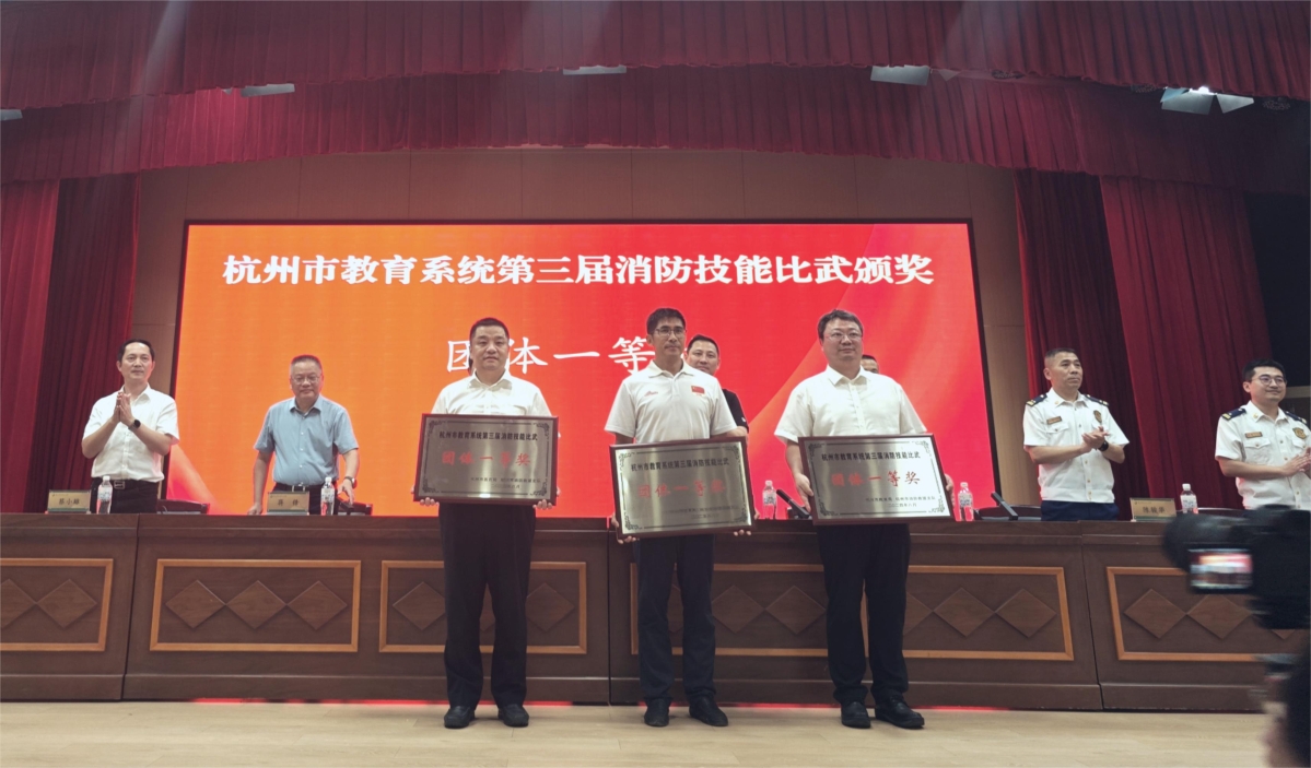 8月26日,杭州市教育系統第三屆消防技能比武活動完美收官!來自全市各區縣的參賽隊伍同臺競技,經過激烈角逐,濱江區教育系統在三個比武項目中,均斬獲第一,并取得團體總分第一名的好成績。