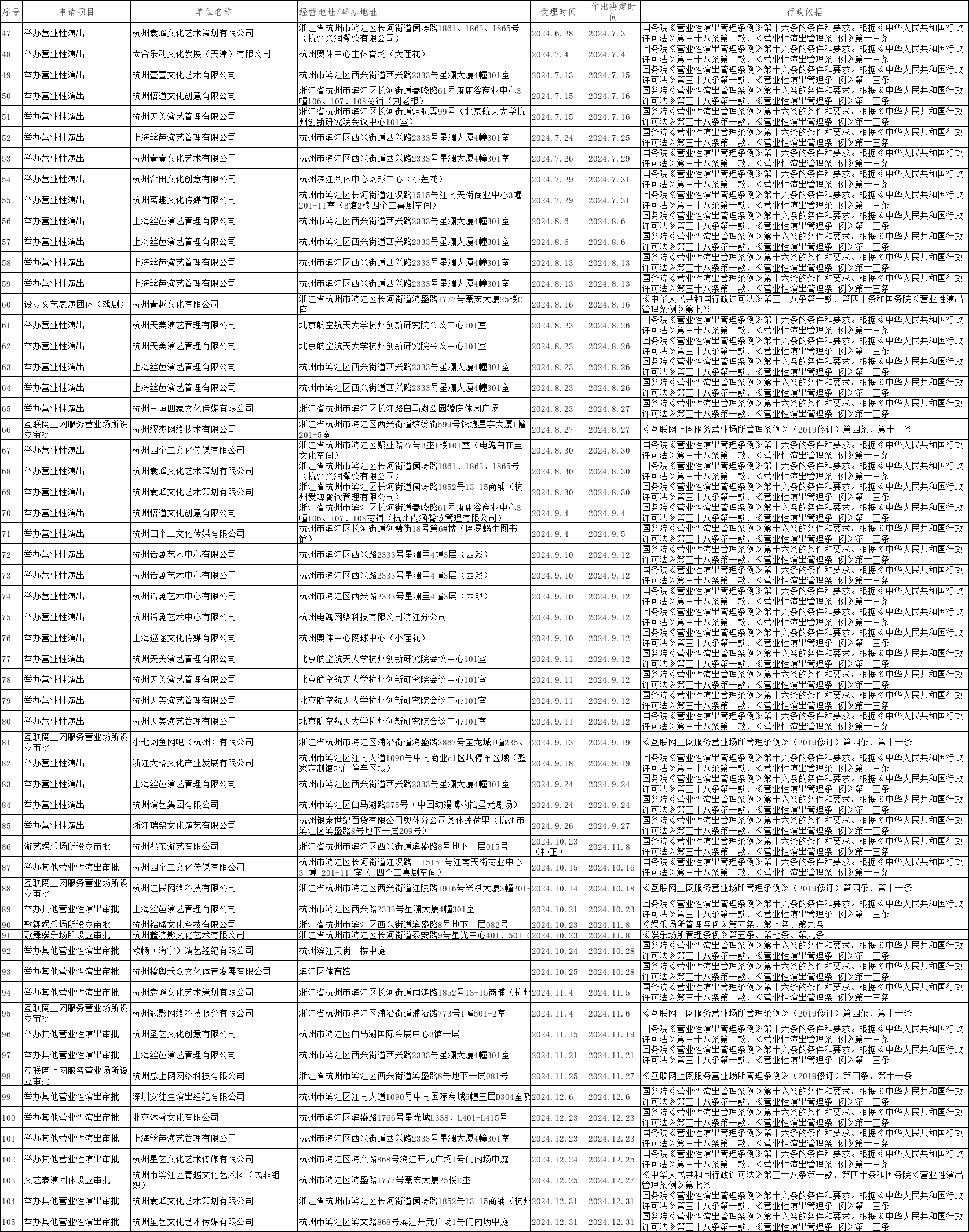 濱江區(qū)文廣旅體局2024年7-12月關于文化和旅游行政許可的公示