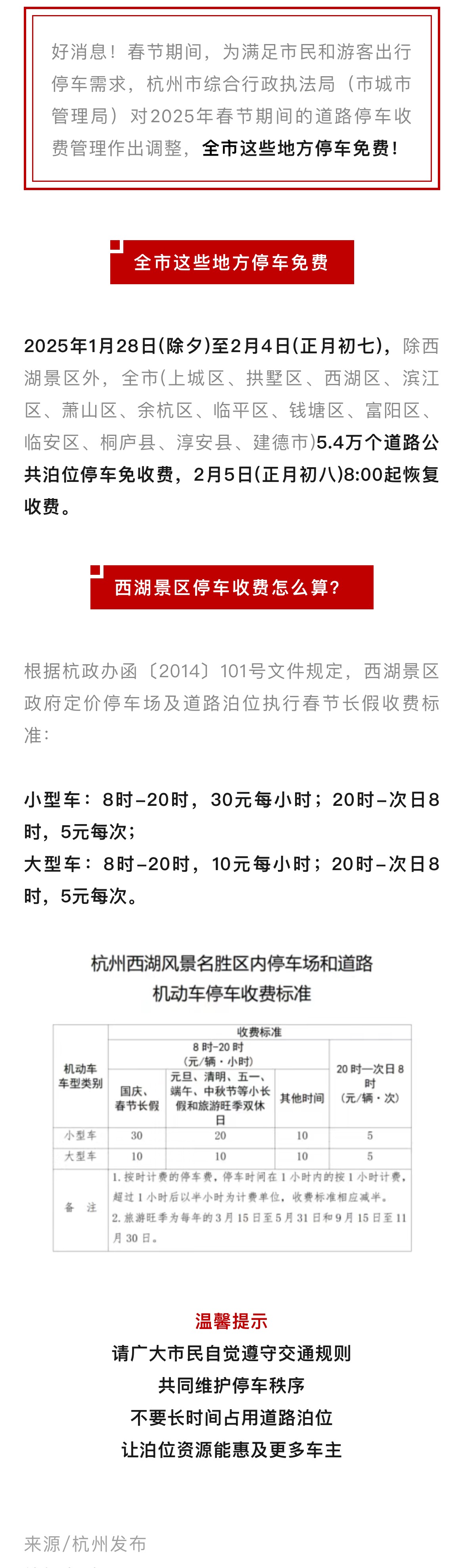 杭州市春節免費停車指南