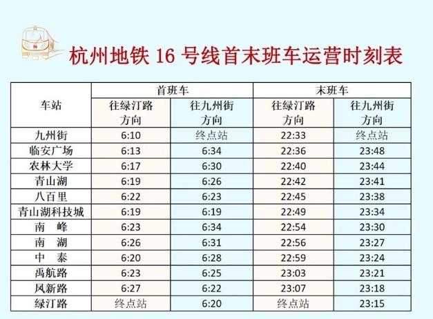 杭州地鐵16號線首末班車運營時刻表