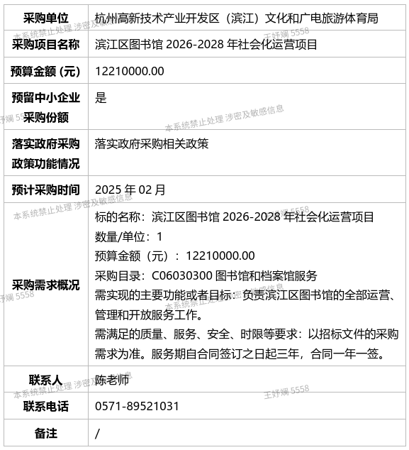 ? ? ? ? 為便于供應商及時了解政府采購信息,根據(jù)《財政部關(guān)于開展政府采購意向公開工作的通知》(財庫〔2020〕10號)等有關(guān)規(guī)定,現(xiàn)將杭州高新技術(shù)產(chǎn)業(yè)開發(fā)區(qū)(濱江)文化和廣電旅游體育局2025年12月采購意向公開如下:? ? ? ? ??