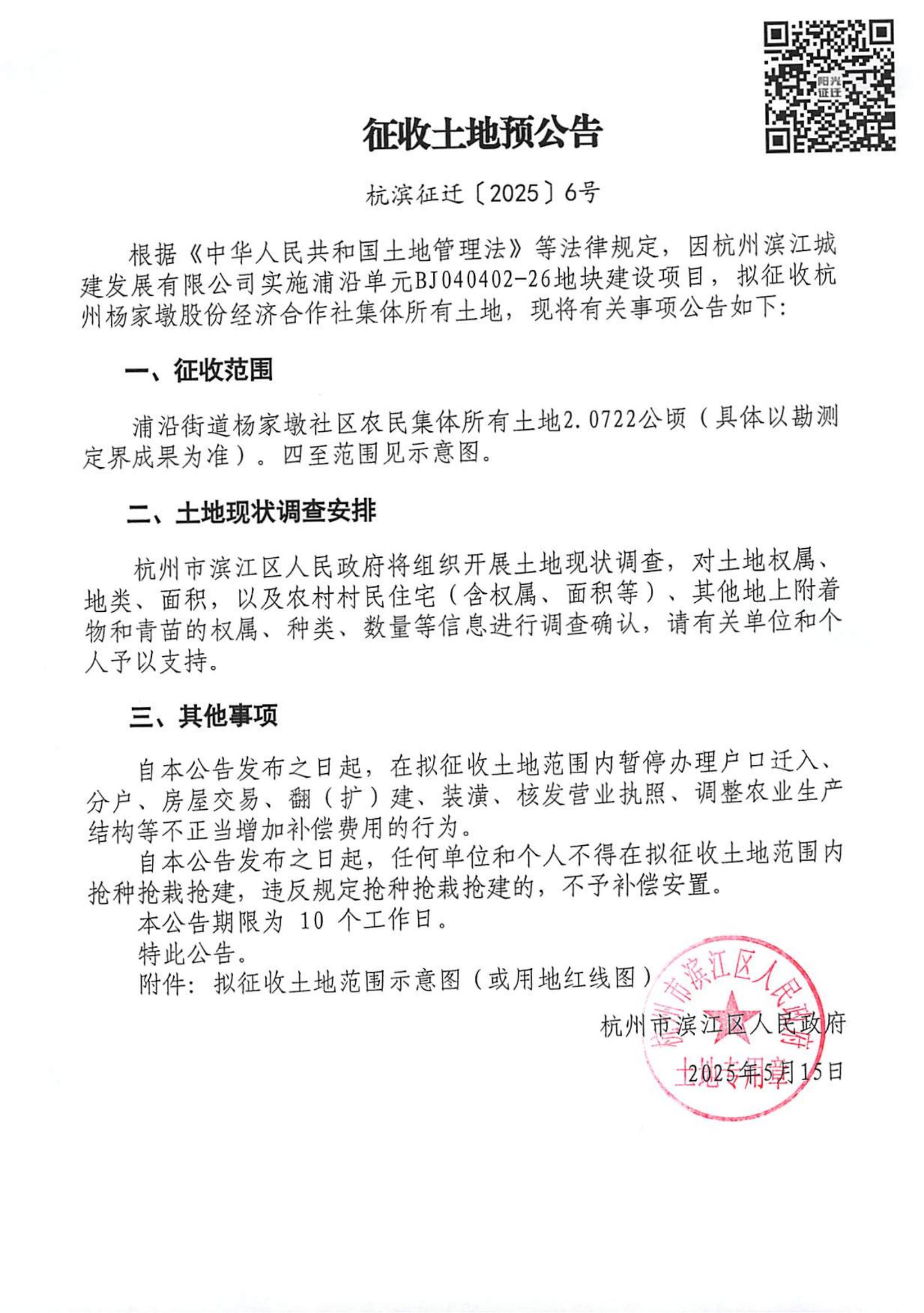 征收土地預公告(杭濱征遷[2025]6號)