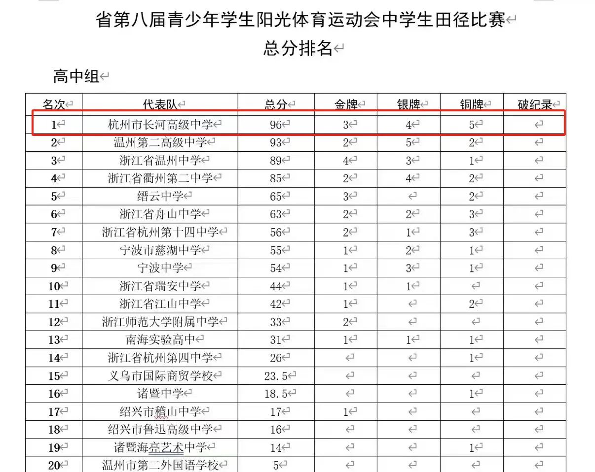 熱烈祝賀杭州市長河高級中學在浙江省第八屆青少年學生陽光體育運動會中學生田徑比賽中,以絕對實力斬獲團體總分全省第一名!本次體育節匯聚全省百余所頂尖中學,長河健兒在省賽各個項目中全面發力:斬獲金牌3枚、銀牌4枚、銅牌5枚!另外,在剛結束的2025年杭州市陽光體育運動會,長河高中獲得總分第二的好成績!