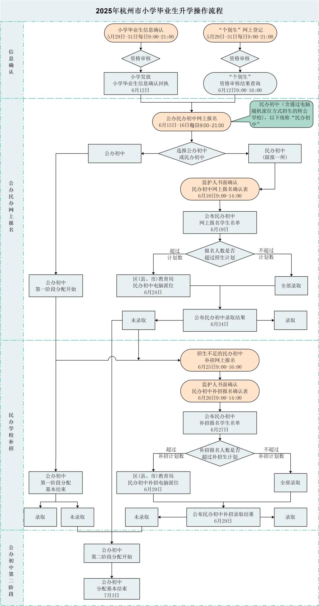 答:經(jīng)監(jiān)護(hù)人簽字確認(rèn)的民辦初中網(wǎng)上報(bào)名、補(bǔ)招報(bào)名學(xué)生名單,由民辦初中所在地的區(qū)、縣(市)教育行政部門公布,家長也可通過【浙里辦App—入學(xué)早知道—杭州市義務(wù)教育階段學(xué)校學(xué)生入學(xué)】查詢,具體時(shí)間為: