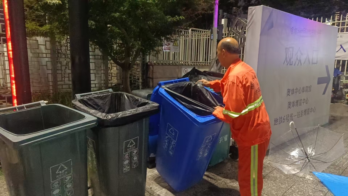 全員上陣,保障現場整潔。活動當天,根據預案部署,增派保潔人員及作業車輛,并通過增加保潔頻次、細化分工調配,確保現場垃圾得到及時清理。各個點位配套設置的分類垃圾桶成為一道隱形防線,保潔人員通過引導觀眾正確投放,大大減輕了后續清理壓力。