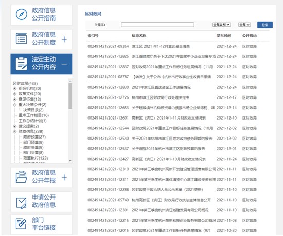 (一)主動及時發布更新財政信息。積極推進濱江區財政資金直達基層專欄建設,按要求開設重要政策、工作情況、情況總結等3個子欄目,動態發布相關信息10余條,以主動公開促使直達資金使用“賬本”更好接受社會監督。持續用好杭州市濱江區人民政府信息公開門戶網站(以下簡稱門戶網站)的財政部門政府信息公開平臺,2021年在該平臺主動公開重大決策目錄、重點工作目標任務進展情況、財政預決算、專項資金、行政執法等政府信息90余條。