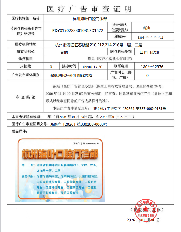 醫(yī)療廣告公示——杭州海葉口腔門診部