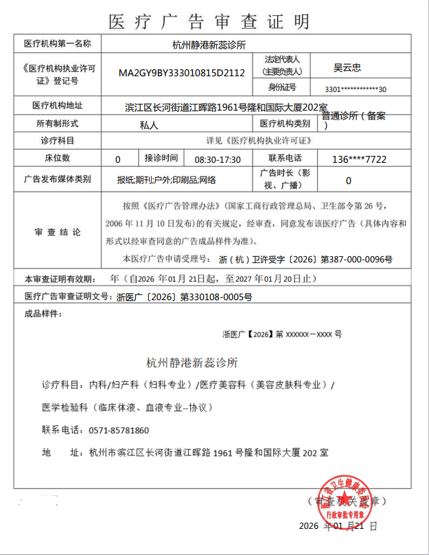 醫療廣告公示——杭州靜港新蕊診所