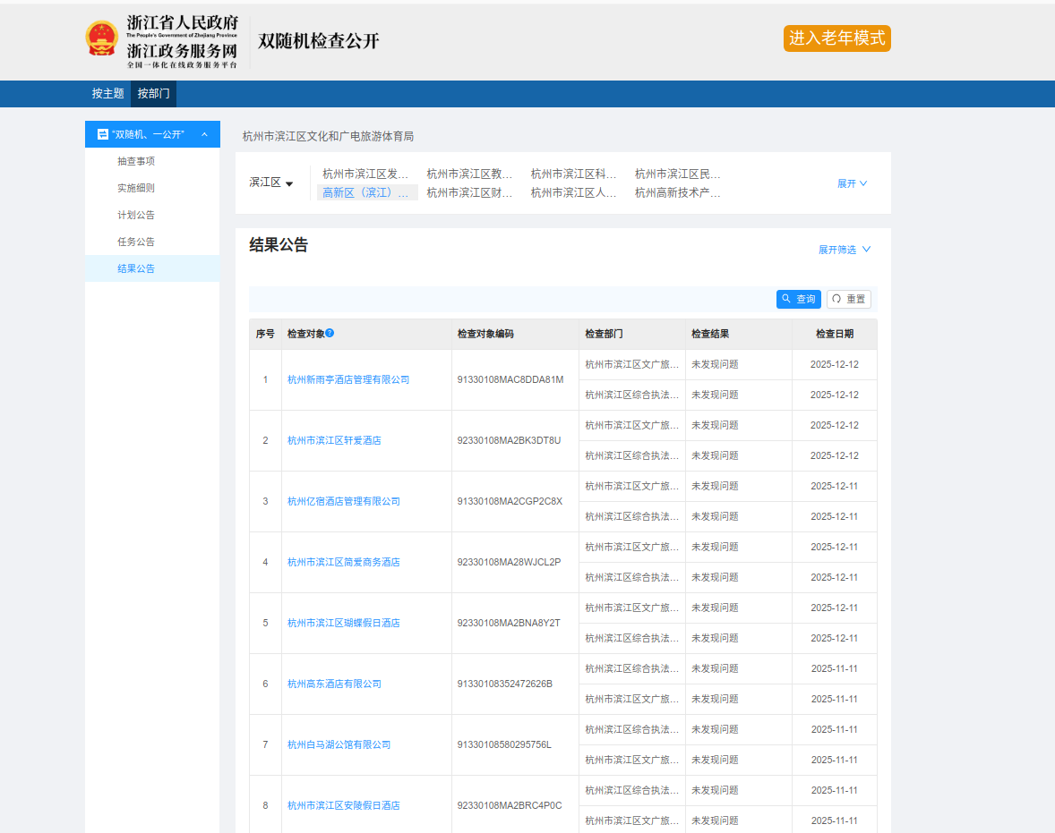 具體內容可在浙江政務服務網中的“雙隨機、一公開”專欄進行查詢。